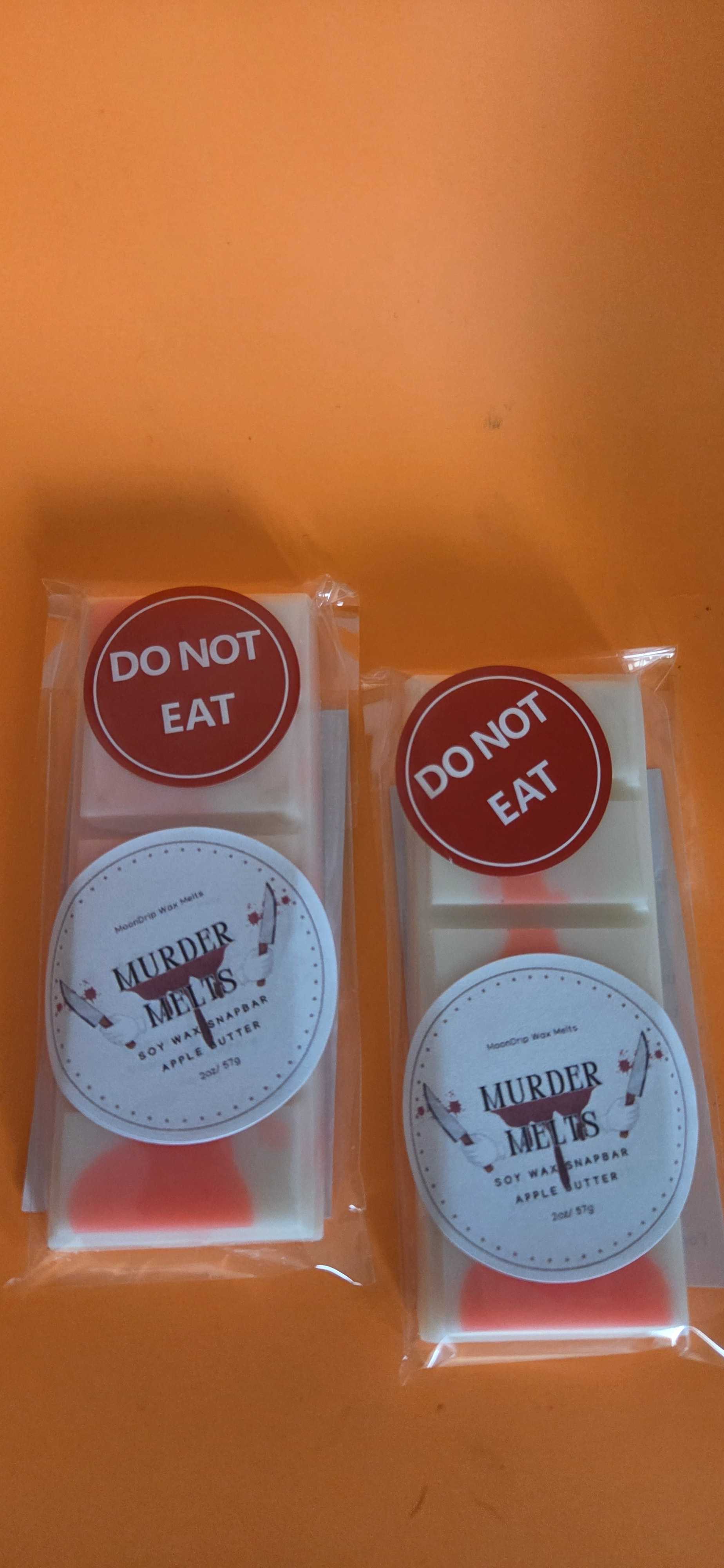 Our murder melts are made from soy wax. They come in two different scent options. They will come in either the scent salted caramel or apple butter. Salted caramel has scent nodes containing caramel, pretzel, and vanilla. Apple butter has sent nodes containing apple, maple, and vanilla.
